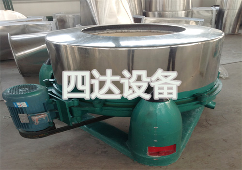 Ф800型不锈钢离心机,是小麦淀粉马丁法生产过程中脱水设备,工作原理:先启动离心机,离心机运转平稳后从上部下料,在离心力的作用下,淀粉浆向四周分离,等离心机内桶上存有100-200毫米时停止下料,用滗铲滗浆,而后第二次、第三次下料滗浆,当观察到离心机内桶上已经存淀粉和内桶边岩相平时停止下料,人工用滗铲分成长方形块取出湿淀粉交给烘干机去烘干,离心机配电机5.5kw,转速每分钟1400转。
